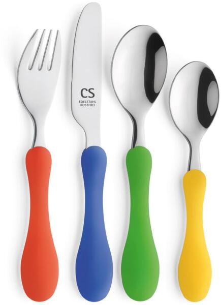 Carl Schmidt Sohn Koch System BABENY gyermek fényes hatású evőeszköz készlet 4 részes, színes műanya fogantyúval rozsdamentes acélból 18/0. Mosogatógépben mosható. Gyártó: Carl Schmidt Sohn GmbH, Solingen, Németország, CS Kochsysteme alapítva 1829.