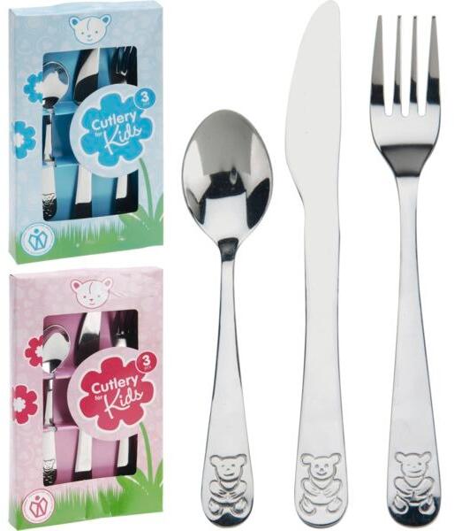 Gyerekeknek szánt evőeszköz-készlet, amely kanalat, villát és kést tartalmaz. Kék és rózsaszín változat, macis motívummal. Rozsdamentes acélból készült. Másodrendű (II. osztályú) termék, apró, kozmetikai jellegű felületi sérüléssel. Gyermekeknek szánt.