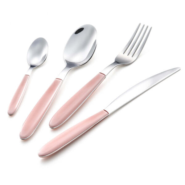 Új evőeszköz-sorozat kellemes, puha és lekerekített formákkal, áttetsző felületű nyéllel többféle színárnyalatban. Anyaga tükörfényes nemesacél, a nyél áttetsző, fényes többrétegű anyagból készült (ABS + metakrilát)