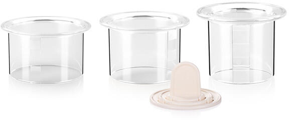 Tescoma PRESTO Food Style Ételformázó hengerek, 3 db Kiválóan alkalmas ételek formázására és réteges előételek, köretek valamint desszertek elkészítésére. A készlet 3 kis formát tartalmaz, melyek mérő skálával vannak ellátva, hogy elősegítsék az egyenletes rétegezést, továbbá tartalmaz egy univerzális tömörítőt és a tároláshoz használatos fedelet. Első osztályú tartós műanyagból készült, mosogatógépben is mosható. A használati útmutató receptekkel együtt a csomagolás belsejében található.