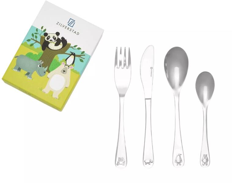 Bájos gyermek evőeszköz készlet. Ez a Zilverstad márkájú gyermek evőeszköz készlet ötvözi az eleganciát a játékossággal, tökéletes a kis étkezők számára. A készlet a Vadállatok sorozat része, és tartalmaz medve, pingvin, orrszarvú és panda motívumokat, gyönyörűen gravírozva a fényes ezüst felületen.